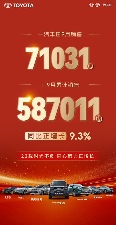 2025 年 10 月 1 日,一汽丰田率先公布 9 月销售业绩;9 月销售新车 71031 辆; 1-9 月累计销售新车 587011 辆,同比增长 9.3%,正增长定式持续延续。